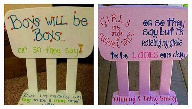 According to Jezebel, the chairs are being sold by a number of online retailers on Facebook, Pinterest, and Etsy. They come in pink, blue, and sometimes green, and they include gag-inducing little poems to let your son or daughter they’re acting outside of acceptable gender norms.
