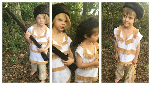 But Davy Crockett? Pinterest showed me a full-on costume and holy plastic glue gun, Batman, I bought some felt, some fake fur, and the kids and I pulled together some awesome-ass Davy Crockett costumes, complete with coonskin caps, while singing the old Davy Crockett song: “Davy, Davy Crockett/ King of the wild frontier.” Oh yeah. We made costumes. That happened in my house. As part of school.