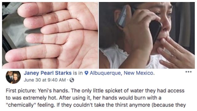 “The only little spicket [sic] of water they had access to was extremely hot,” Starks shared photos of Yeni’s scarred hands. “After using it, her hands would burn with a “chemically” feeling. If they couldn’t take the thirst anymore (because they were given NO WATER), they would have to scoop this hot, chemically water into their mouths.”
