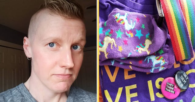 My gender identity is nonbinary. I am both male and female. Usually I just feel like me, but I am always a mix of both genders, and my gender expression is masculine. People often misgender me. It is a pretty even mix of being called either male or female. Because I have a feminine name, when I am on the phone with people, I get called ma’am. When I walk into new spaces, I am often called sir or referred to as he, then people quickly switch to ma’am or she when someone takes a closer look and sees that I have breasts—which causes me tremendous dysphoria. I tell people my pronouns because I don’t want to be frustrated and further hurt by what people think they know about me based on my name or physical self.