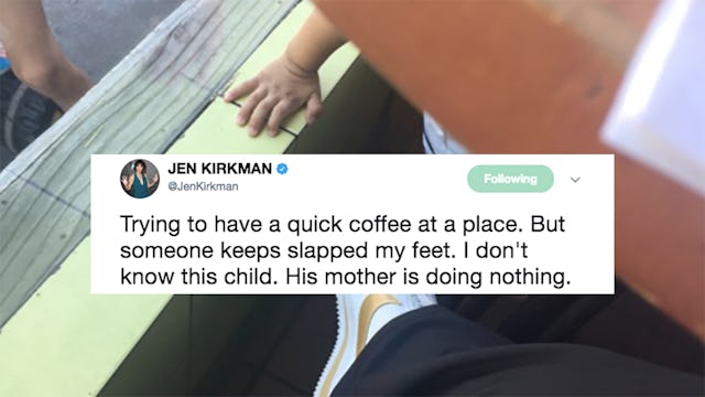 “Trying to have a quick coffee at a place. But someone keeps slapped [sic] my feet,” she tweeted. “I don’t know this child. His mother is doing nothing.” My god, parents. This is why we can’t have nice things.