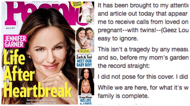 Garner starts off by mentioning the People article and cover that “appear” to be coming from her. She then acknowledges that as a celebrity, bogus tabloid stories are written about her all the time . It’s simply part of the territory. “It isn’t unusual for me to receive calls from loved ones thinking I forgot to tell them I am pregnant–with twins!–(Geez Louise), but those are so ridiculous they’re easy to ignore.”