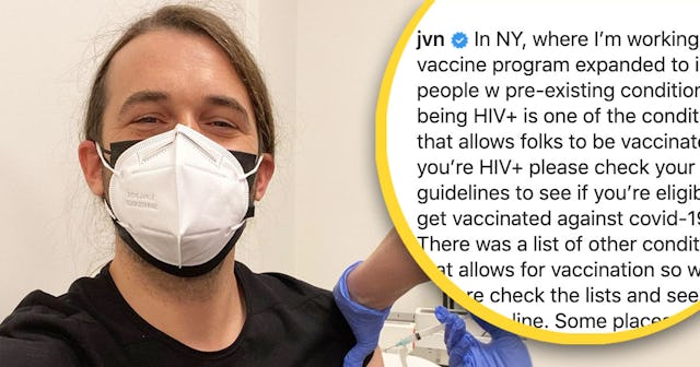 Van Ness took to Instagram with the important message and a snap of his own vaccine moment. “In NY, where I’m working the vaccine program expanded to include people w pre-existing conditions, being HIV+ is one of the conditions that allows folks to be vaccinated, so if you’re HIV+ please check your states guidelines to see if you’re eligible and get vaccinated against covid-19!” he writes.