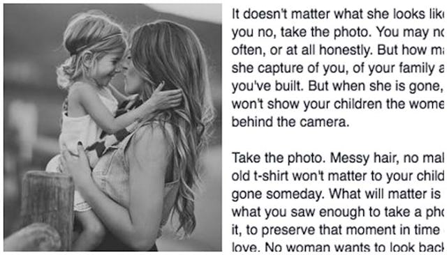“But when she is gone, those photos won’t show your children the women who was behind the camera. Take the photo. Messy hair, no makeup or a dirty old t-shirt won’t matter to your children when she is gone someday.” While Schimpf geared her words towards men, her point cuts both ways. In every family there’s the adult who’s the designated historian, the person who always makes sure to capture special moments on film. They’re the ones who can show you what the family looked like on Christmas morning every year since the kids were born, but since they’re the ones taking all the pictures, they’re rarely in the frame. And while our kids will surely appreciate having pictures of themselves to look back on one day, they’ll want to see us there too.
