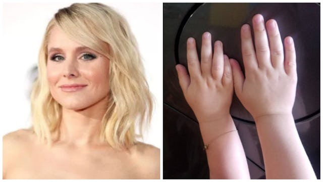 Bell’s photo shows two adorable little hands (and a seriously cute bracelet) that we assume belong to her daughters.