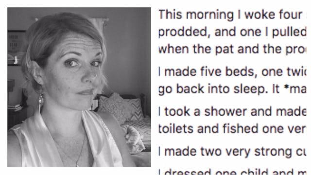 Petrone starts by talking about her efforts to wake up “four sleepy humans,” which — as many of us know or can imagine — is a herculean task. “Some I gently patted, some I prodded, and one I pulled the covers off and tried to roll onto the floor when the pat and the prod fell short,” she wrote. Somewhere in there she even manages to make herself a cup of coffee and fish a wet pull-up out from under her bed, because for every morning success there is a morning punishment. That’s just the way it goes when you’re a parent.