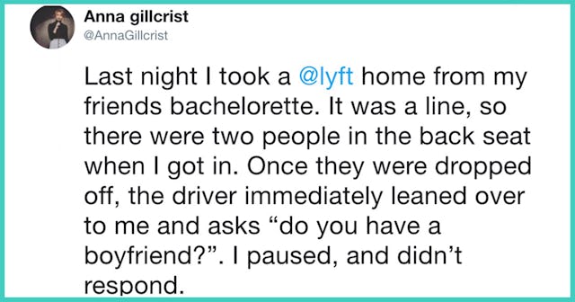 “Once they were dropped off, the driver immediately leaned over to me and asks ‘do you have a boyfriend?’ I paused, and didn’t respond,” Gillcrist tweeted. “He asks again, “come on do you have a boyfriend?” I said yes. He continued to ask me questions about what he did, and what I did. Then he asks, ‘is your boyfriend in town?’ I didn’t respond. He asks again. I don’t respond.”
