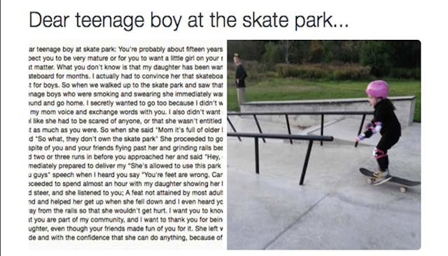 When Jeanean Thomas arrived at a local skate park with her little girl, she was ready for the potential issues. As predicted, she immediately noticed it was overrun by teenage boys, “smoking and swearing,” and her little girl expressed doubts of whether she should be there. Thomas quickly realized her concerns were unfounded, thanks to the actions of one very special kid. Check out an excerpt from her open letter to the teen boy who turned it all around: