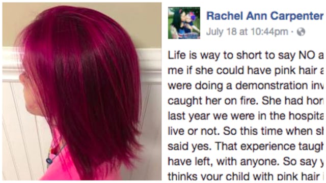 Last summer, Rachel Carpenter’s ten-year-old daughter, Nevaeh, wanted pink hair. Carpenter wouldn’t allow it and off she went to camp. “A few days later at a camp they were doing a demonstration involving fire and something went wrong and it caught her on fire,” she explained on her Facebook page. Over 70 percent of Nevaeh’s body was burned and the family found themselves in the hospital unsure if their little girl would survive.