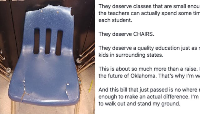 Last week, Kovacs decided to publicly share why she’s joining in Oklahoma’s teachers strike. She explained that she’s earning $27,732 a year, her classroom is stuffed to overcapacity, and there’s barely enough supplies to go around. That includes chairs. Yup, some students literally don’t have a place to sit — and the chairs that are in the classrooms are pretty much completely broken. See below:
