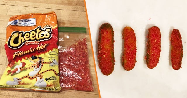 First, you get your Hot Cheetos and make a very valuable dust out of them by putting them in a sandwich bag and slapping it with a rolling pin. You can make it as fine or as chunky as you want.