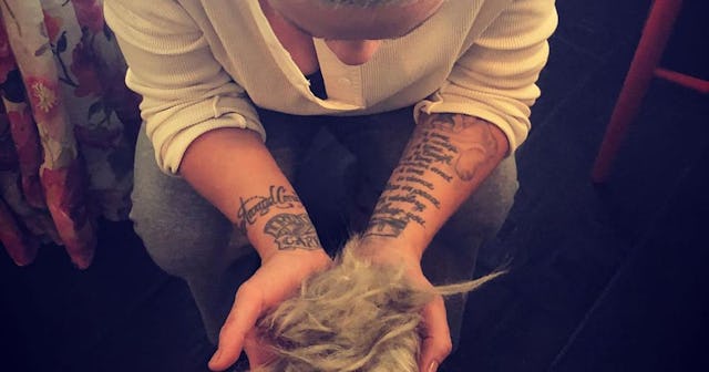 She captioned a stunning snap of her shorn head, hair in her hands, simply, “Letting go.”