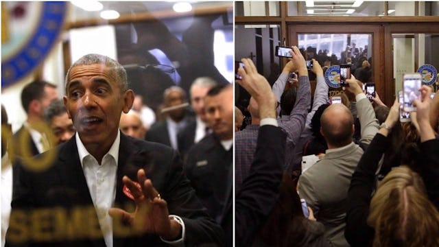 A security guard at the courthouse reportedly warned the swaths of photographers, reporters, court staff, and attorneys not to photograph the room. Yeah, good luck. Once Obama came on the scene people kind of lost their shit and swooned. The crowds rushed up to the glass doors to catch a glimpse and take a picture.