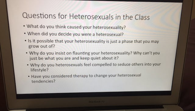 The questionnaire was titled, “Questions for Heterosexuals in the Class” and included a list of questions typically asked of homosexuals.