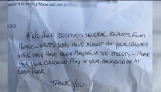 Peters says the note can’t actually be about his kids’ safety, because multiple families in the neighborhood have kids that play in front of their homes and ride their bikes in the neighborhood’s quiet streets.