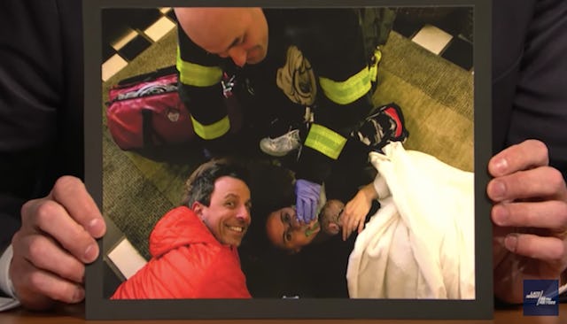 “She looked like someone who was hiding a baby in a pair of sweatpants,” Meyers told the audience, giggling, before showing them a picture of the three of them, on the ground and surrounded by firefighters and police officers.