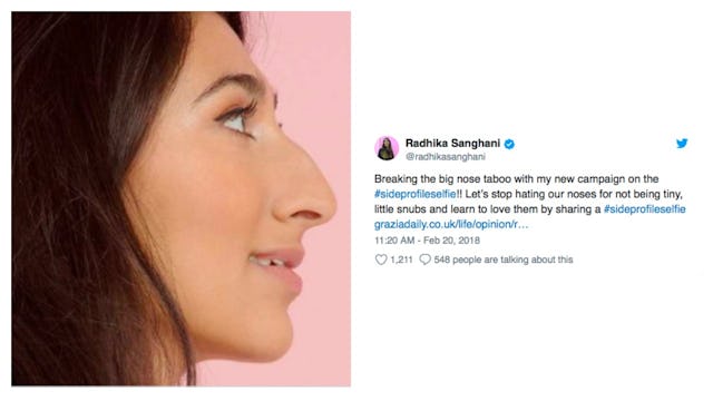 Sanghani is inspiring other women around the world to feel more confident with the nose they were born with as they are now posting pictures of their #SideProfilesSelfie without shame.
