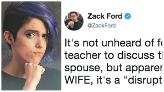 Discussing inappropriate or sexual topics with elementary school students is a completely different thing than mentioning your sexual orientation — let’s get that clear. Plenty of heterosexual teachers probably mention their husbands and wives all the damn time. Because that is a normal, conversational thing — and it’s probably safe to assume most elementary-aged children know what a spouse is. Since when is being part of the LGBTQ community considered “adult” or inappropriately explicit? Gimme a break. She has a fucking wife. There are gay people in the world. What’s the big secret?