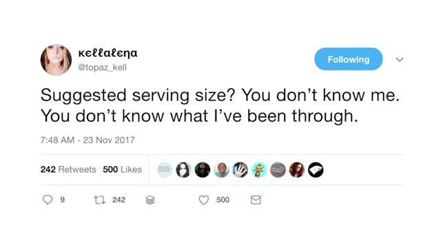 I know it’s unhealthy, so please spare me your workout accountability groups and sadness shakes. I’m not here to change my lifestyle, I’m here to complain and share hilarious tweets. So here are some that all stress-eaters will understand: