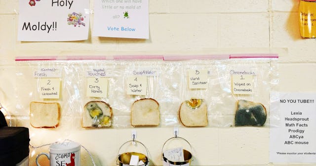 As you can see, the bread that had been touched by dirty hands and wiped on the students’ Chromebooks had the most mold, and the one with hand sanitizer is a close third. “As somebody who is sick and tired of being sick and tired of being sick and tired,” the Idaho teachers wrote, “Wash your hands! Remind your kids to wash their hands! And hand sanitizer is not an alternative to washing hands!! At all!”