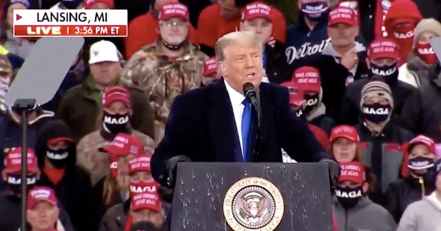 In his increasingly desperate spiral as Election Day closes in and the polls continue to not go his way, President Donald Trump has made some pretty bonkers claims. The dude is listing “ending COVID” as one of his accomplishments and continues to spew all manner of falsehoods at his looney rallies with his usual utter disregard for facts. Now, he’s back on a pet topic of his as of late — trying to woo the suburban women voters who are fleeing from him in droves. This time, he’s promising all of us little ladies that he will “get our husbands back to work.”