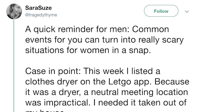 Twitter user @tragedythyme spelled it all out in her thread about selling a dryer on LetGo. As a woman reading the thread, I was nodding the whole time because yeah, totally been there.