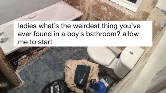 Twitter user @jodieegrace got the party started by putting out a call to action. “Ladies what’s the weirdest thing you’ve ever found in a boy’s bathroom?” she asked. “Allow me to start.” She posted a snapshot of a hairbrush attached to a plunger which makes exactly zero sense.