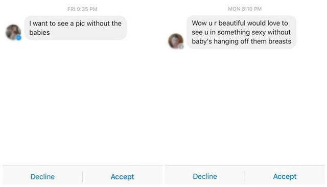 There were 400 of these. FOUR HUNDRED. On Facebook. Where your name, picture, and profile are attached to every message you send. These men had no shame. They had no problem blatantly sexually harassing a woman, even though their very public profiles were attached to the words they were sending. “It’s no wonder that women are terrified to nourish their babies,” Rebecca told Scary Mommy.