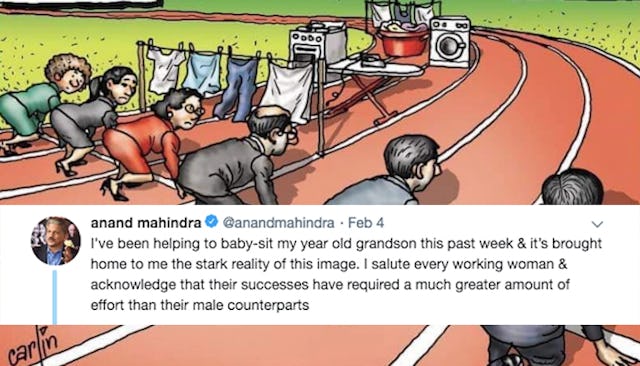 And also such an important point from a couple of responders, about how a powerful businessman like Anand Mahindra who is really on our side should show his concern by changing his work policies to help women, such as better parental leave and sick leave policies – and more concrete rules for equal pay and promotion.