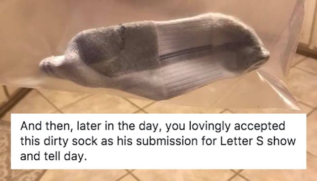“And then, later in the day, you lovingly accepted this dirty sock as his submission for Letter S show and tell day,” she continues in her note of thanks to her son’s preschool teacher. “Please know that I try. I tried to get him to take his sister’s stuffed animal sloth for show and tell. I suggested a Skylander. And a soccer ball. But the dirty sock won because there are only so many battles this mama can fight.”