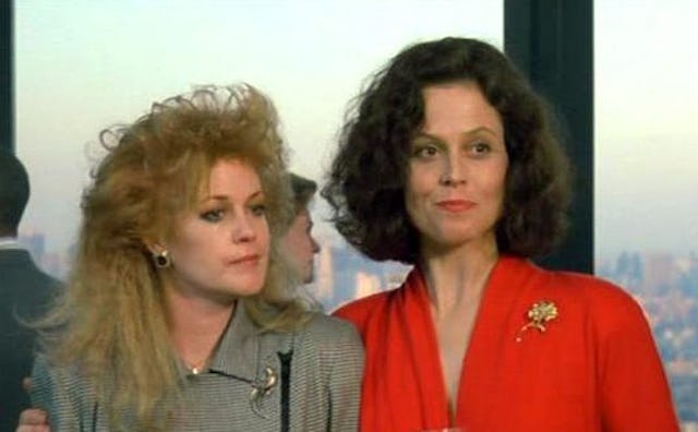 9. The three other working women in the movie—Joan Cusack as the best friend, Olympia Dukakis as the HR manager and Sigourney Weaver as the ice-queen boss—encapsulate three approaches to entrenched sexism in the workplace: Joan Cusack is “know your place and don’t hope for much” when she says, “Sometimes I sing and dance around the house in my underwear. Doesn’t make me Madonna.” Olympia Dukakis is all “go along to get ahead”: She tells Tess that you don’t succeed in this world by calling your boss a pimp. And Sigourney Weaver is the ball-busting, backstabbing bitch. All legitimate if necessarily flawed paths. Tess forges a fourth path, which is, er, living a double life as an imposter.