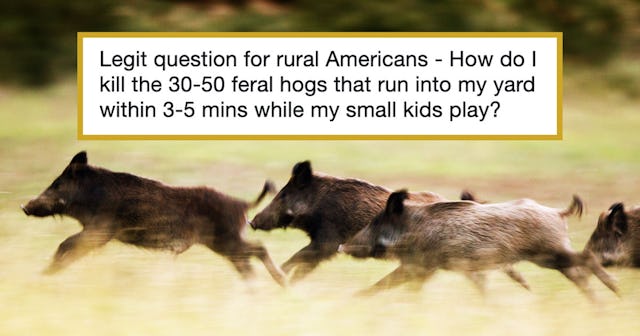 “Legit question for rural Americans – How do I kill the 30-50 feral hogs that run into my yard within 3-5 mins while my small kids play?” he asks.