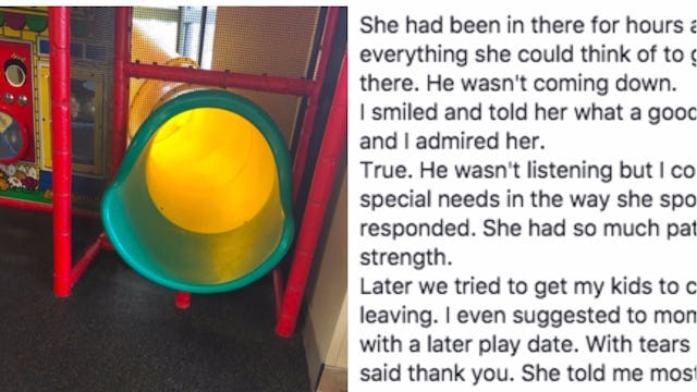 This fellow mom was having trouble coaxing her son down from inside a slide. Hours of trouble. Because according to Stacey’s post, the boy who wouldn’t come down from the slide had special needs.