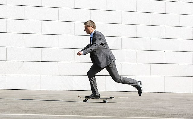 The funny thing is, men seem to think women find a man in business attire freestyling on a rail in the parking lot irresistible. “This thing is a chick magnet,” one 39-year-old skate rat in a suit told the New York Post. “Women like anything that’s unusual—and this is edgy without being over-the-top.” Oh, is that a fact, sir? I have a sneaking suspicion most of my friends who are raising teen boys would rather not be dating or married to one, but I could be wrong.
