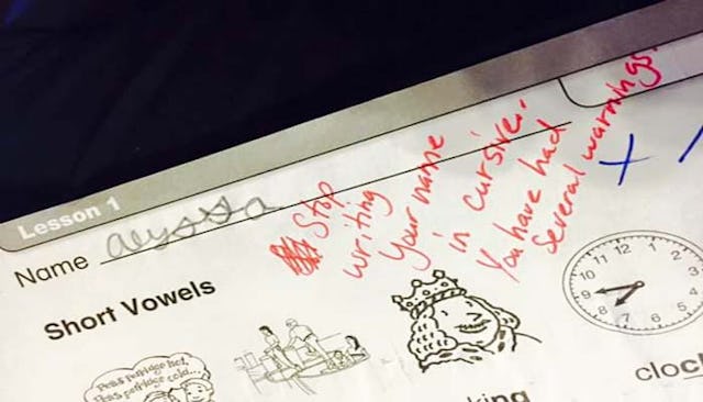 A seven-year-old girl came home with a not-so-nice message on her class assignment: “Stop writing your name in cursive. You have had several warnings.” Come again? Since when is it wrong to sign your name in cursive? Also, it looks like the teacher started to write her little note in cursive, which is hilarious.