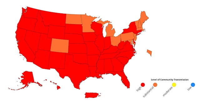 The most recent maps of the U.S. show a country that looks like it’s on fire. The latest available federal data paints a very bleak and very crimson picture of our nation as Delta spreads rapidly. Right now, 72.48 percent of U.S. counties are reporting high community transmission with 16.55 percent reporting substantial community transmission. That leaves less than 5 percent of counties reporting low transmission. And it’s important (and terrifying) to note that these numbers are before the vast majority of states have sent kids back to school.