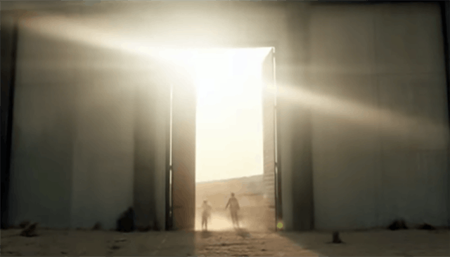 They cross another desert. A man gives the little girl a bottle of water. And then, when their journey is finally over, they reach Donald Trump’s endless wall. The mother cries. The little girl takes out a tattered American flag she made throughout the journey from pieces of refuse. And then a door opens up. They walk through, and it cuts to a pickup truck. “The will to succeed is always welcome here,” white words say. “84 Lumber.”
