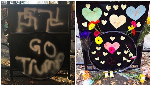 The incident is just the latest in a disturbing string of hate crimes in the aftermath of President-Elect Trump’s election-night victory, incidents he has largely declined to comment on, aside from saying to “stop it” during an interview with Lesley Stahl on last Sunday’s “60 Minutes”. Thankfully, the future of the country doesn’t need “60 Minutes” to know that this kind of vandalism is unacceptable, and they’re stepping up, to fight back against hate with its exact opposite.