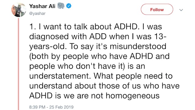 Yashar Ali, a freelance journalist who has contributed to HuffPo and New York magazine, took it upon himself to combat some of that stigma singlehandedly. Ali is an adult who lives with ADHD, and in a must-read Twitter thread, he explained some of the most common misconceptions about the illness, and how it affects his day-to-day life.