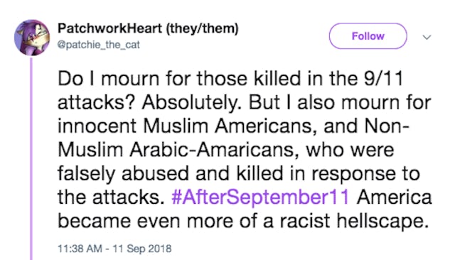 She explains that she created the hashtag so people could share their own stories about what post-9/11 life was like for them — and they aren’t easy to read.