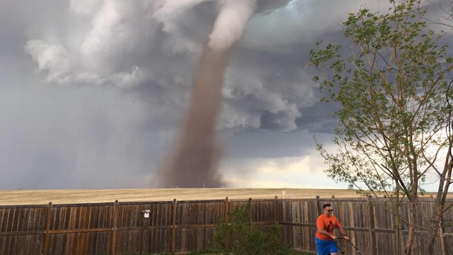 There is a photo going viral of a man mowing his lawn with a tornado looming in the background in Alberta, Canada. He’s reached peak husband.