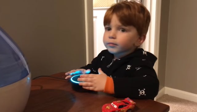 The boy says, “Alexa, play digger digger” and presses the button, patiently waiting for his request to be answered. We’re guessing that’s some kind of fun construction vehicle-related song or cartoon.