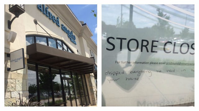 According to USA Today, Alfred Angelo Bridal closed 60 of its stores and filed for Chapter 7 bankruptcy liquidation in Florida, where the company is based. Store managers were reportedly not alerted to the closures and many stores were locked up for the last time Thursday with no warning to employees or customers. This is the sign posted on a store door in Castleton, Indiana.