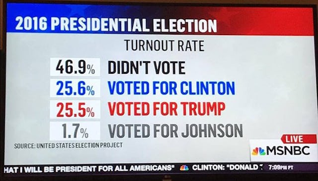 There’s an MSNBC screenshot going viral today that may make you want to rip all your hair out, cry, and then gorge on some Oreos. It seems almost half the country didn’t vote. Yup, that’s right, 46.9% to be exact.