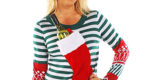 Luckily, Amazon is coming through for the win again this year, selling a Tipsy Elves Women’s Christmas Stocking Tacky Sweater, and you can still get in time for Christmas because the retailer loves us and wants us to be happy. The sweater is adorable on its own but there’s a secret pocket on the front that holds an entire bottle of wine (or vodka if your racist uncle Jim is coming again this year) just for us.