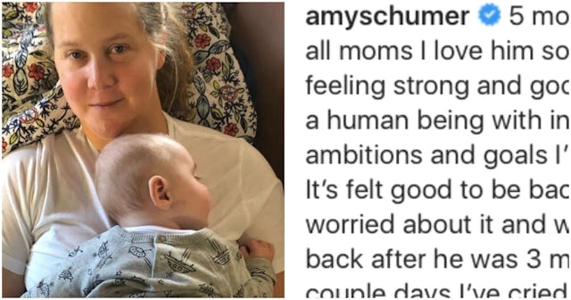 Amy Schumer has shared a lot about her first experience as a mom — the highs, the lows, and everything in between. Her honesty is refreshing and it’s nice to see a celebrity posting non-filtered photos and hilarious commentary about motherhood — things we can all relate to as we all try to muddle our way through parenthood. The comedian’s latest post is more serious, asking working moms what their experiences have been, and sharing her own after going back to work herself.