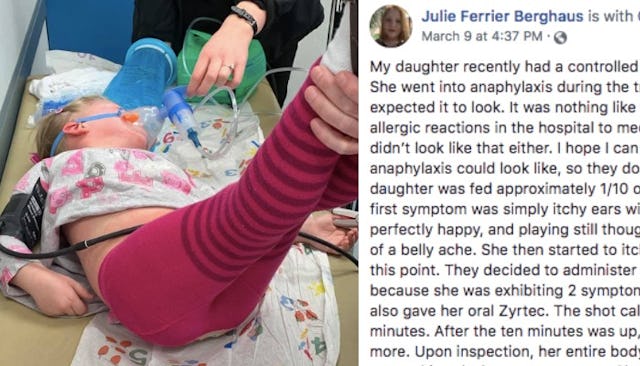 “Please if you are one of the people that cares for my child or spends time with her, be careful what you eat around her, what you give her, and DON’T be afraid to give epi,” she wrote. “She had zero side effects from the epi. It could save her life. Much rather safe than sorry. There is NO danger in giving the epi to her even if she ended up not in a true reaction, she has no underlying heart disease or anything. Epi will NOT harm her, even if it wasn’t needed. You want to react before she gets this severe! It’s a matter of life and death for her.”