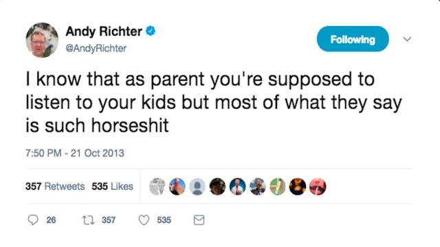 There are a few celebrities whose Twitter feeds remind us that no matter how rich or beautiful you are, parenting is mostly the worst. We appreciate their commitment to truth, honesty, and hilarity, because who needs a laugh more than parents? One of those celebs is Andy Richter, whose tweets about being a dad will make you laugh so hard you’ll temporarily forget that you’re never going to sleep again.