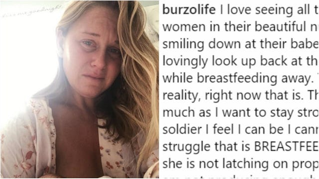 “…I cannot hide the struggle that is BREASTFEEDING. Whether she is not latching on properly, whether I am not producing enough milk to keep up with her demand, whether my nipples might not be adequate, whether we confused her with having to give her a bottle after pumping….whatever it may be it has been an emotional and painful struggle. Today has been full of no naps, sucking and not eating, crying and frustrated parents,” Burzo writes.