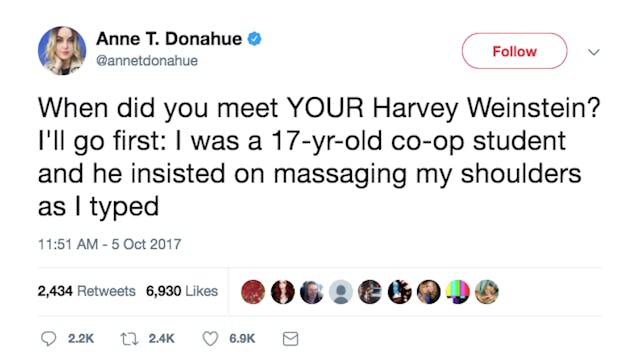 “When did you meet YOUR Harvey Weinstein?” she asked. Because you’d be hard-pressed to find a woman who doesn’t have a Weinstein-like story. This thread proves it.